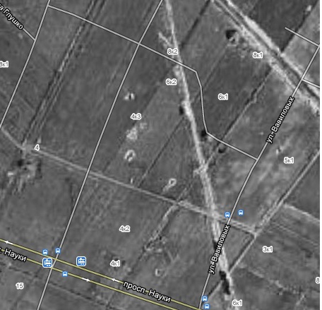 В 42-ом году, судя по съемке, там уже были только голые поля, вряд ли перед застройкой квартала что-то специально могли посадить. Да и сосны растут довольно быстро, видимо при благоустройстве уже застроенного квартала их и посадили.