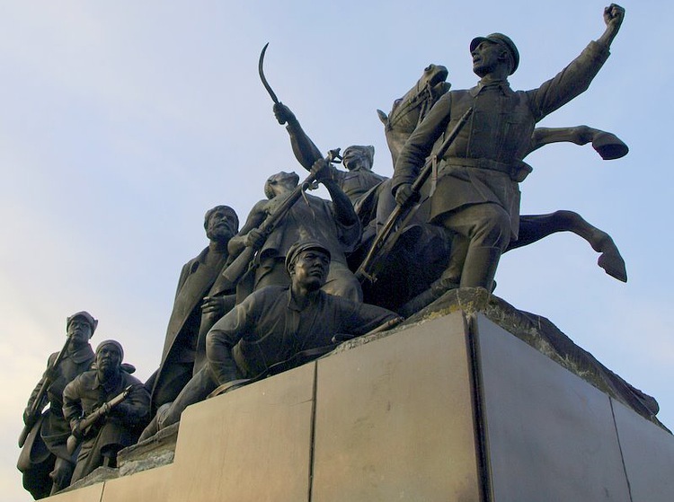 На имеющейся у меня архивной семейной фотографии, сделанной на фоне памяника Чапаеву в начале 60-х годов (еще на низком деревянном постаменте), штыки винтовок уже отсутсвуют. Во всяком случае у участника во втором ряду (с закинутой головой) скульптурной композиции.