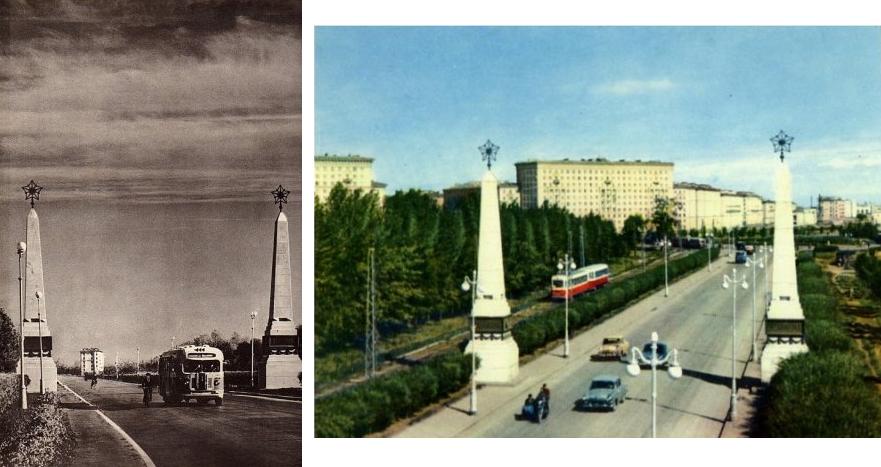 В качестве контрольной использую цветной снимок 1950-х годов, обелиски очень похожи, но упомянутого здания нет, фонари другие, не видно признаков трамлинии, да и проезжая часть выглядит как-то иначе...
