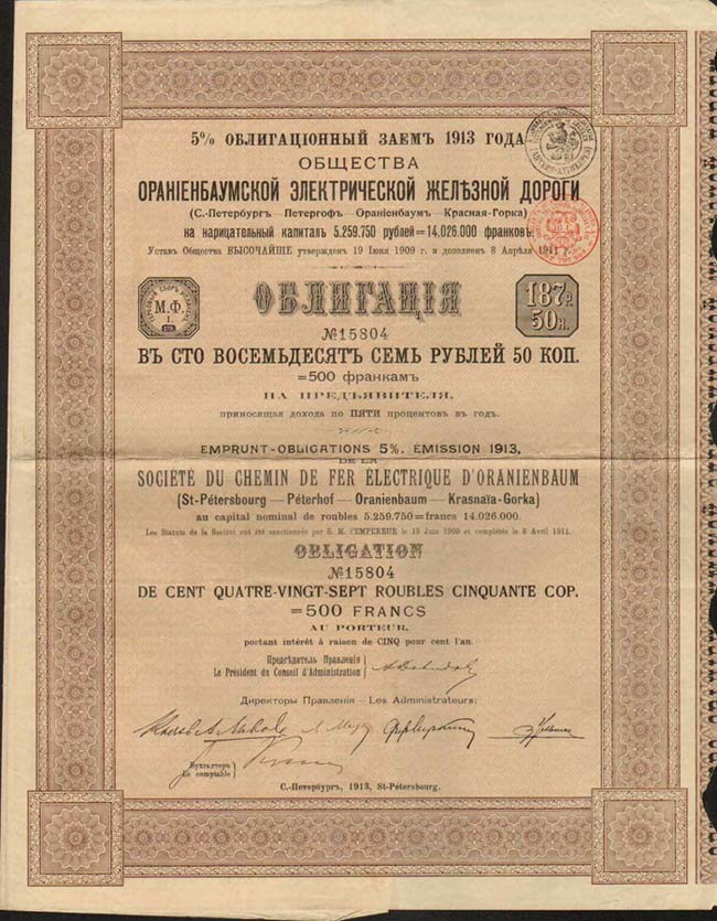 Облигация Ораниенбаумской железной дороги:
