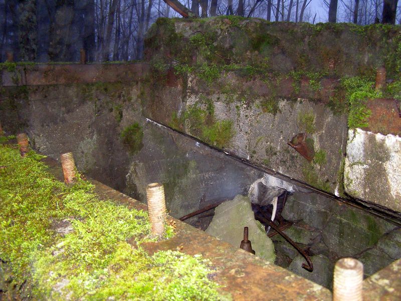 Между этими двумя дотами обнаружен бетонный колодец глубиной метра три, со скобами-ступенями. Внизу в колодец выходит труба сечением наверно сантиметров 10. Труба по направлению идет к ближайшему к колодцу доту. Предположили, что возможно это электрический колодец, а труба предназначена для протаскивания кабеля.