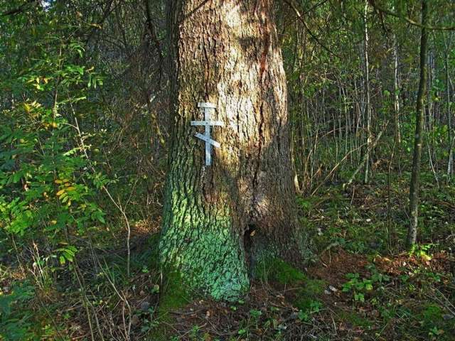 Сейчас, о злодеянии в Шаломино напоминает православный крест из жести, на стволе старой ели.