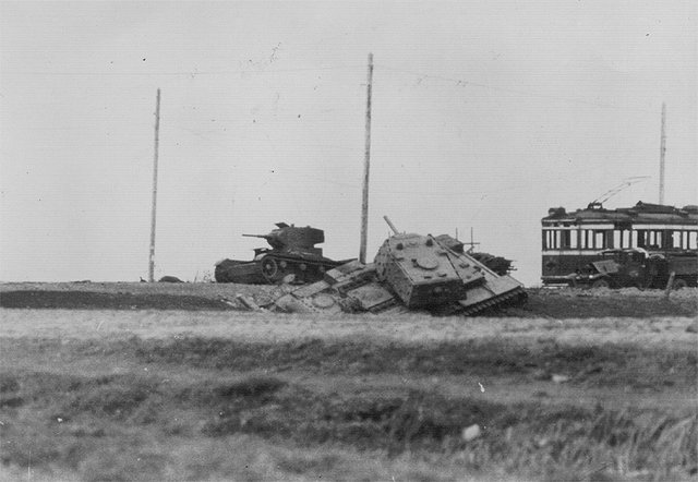 Только танки не немецкие, а советские, разбитые немцами. Вроде как это хрестоматийное советское наступление осенью 1941 на Стрельну-Петергоф.