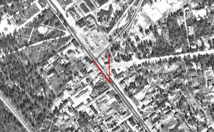 Именно так, а еще обратите внимание, что линия прямо уже с деревянными столбами. Это соответствует версии: линия по пр.Энгельса пристроена к старой Лесновской в 1926 году.