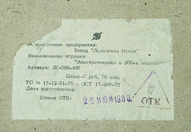 Познавательная игра - конструктор "Электротехника в 200 опытах". Завод "Ленинская искра", ПО "Источник". Знакомит с физическими явлениями и законами на практике. Позволяет собирать различные модели и приборы.
