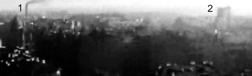 Здание на Съезжинской действительно очень похоже. Вероятно, оно и есть, хотя я совершенно не могу понять - какие объекты мы видим справа. Я их обозначил 1 - купол и 2 - башня.