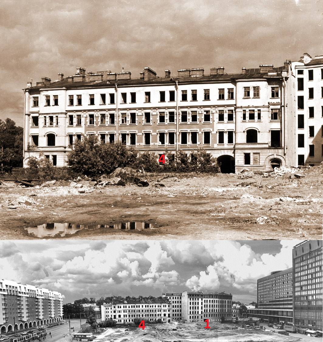 Поскольку все-таки плохо представляю расположение снесенных домов (а они меня очень интересуют, часто проходил мимо), попробовал применить ту же схему, что и на площади Мужества, и стало как-то яснее. Выношу на Ваш суд.