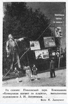 Впрочем, одинокий бюст в 1960-е годы время от времени дополнялся многометровой гальванопластической фигурой вождя, периодически устанавливаемой на время проведения в парке, близ Летнего театра, различных идеологических выставок под открытым небом, типа «По ленинскому пути (к 60-летию II съезда РСДРП)», без которых отдых трудящихся в парке вряд ли был бы полноценным. Интересно, что путь в светлое будущее Ильич указывал "неканонической" левой рукой.