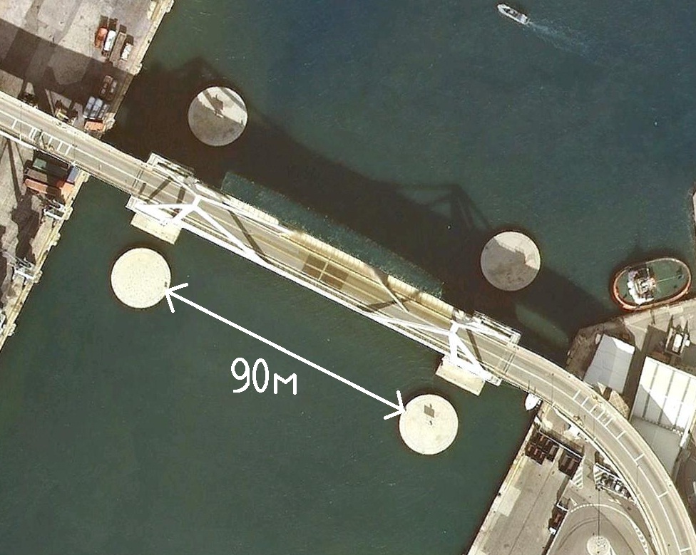 Если измерять ширину прохода под мостом по воде, получается 90 м