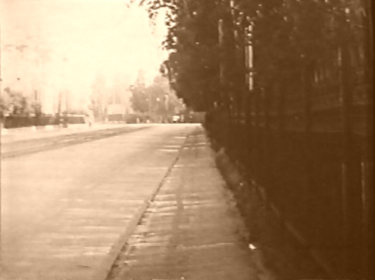 В кадре строительство пристройки мехкорпуса, мехкорпус, "колодец", 2-ой учебный корпус, главное здание, гидробашня. За забором(академии связи?) видны рельсы от крана.