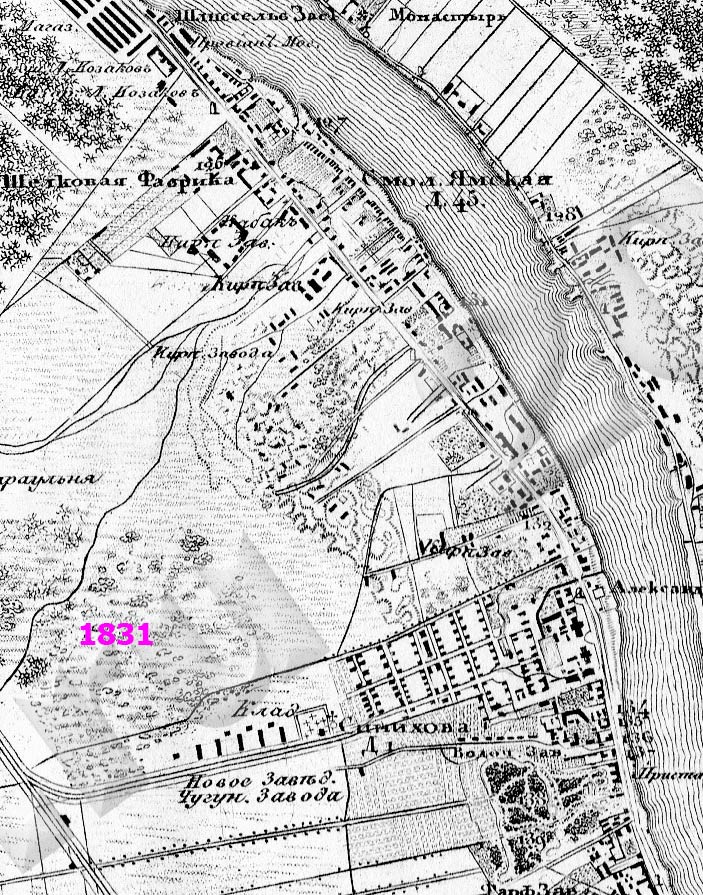 На двух картах: 1839 и 1904 года у самого обреза листа видна регулярная застройка (нижний правый угол фрагмента). Расскажите, что это могло быть, и где она локализуется ныне.
