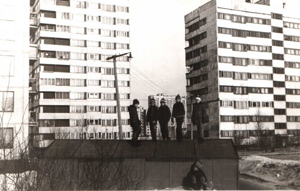 И еще один снимок, относится к скверу между ул. Ольги Форш и Демьяна Бедного. Год 1987-1988, примерно. Взят из фотоальбома группы (http://vk.com/club2016434), выложен Натальей Хлыновой (Гавриловой) (http://vk.com/id1834248).