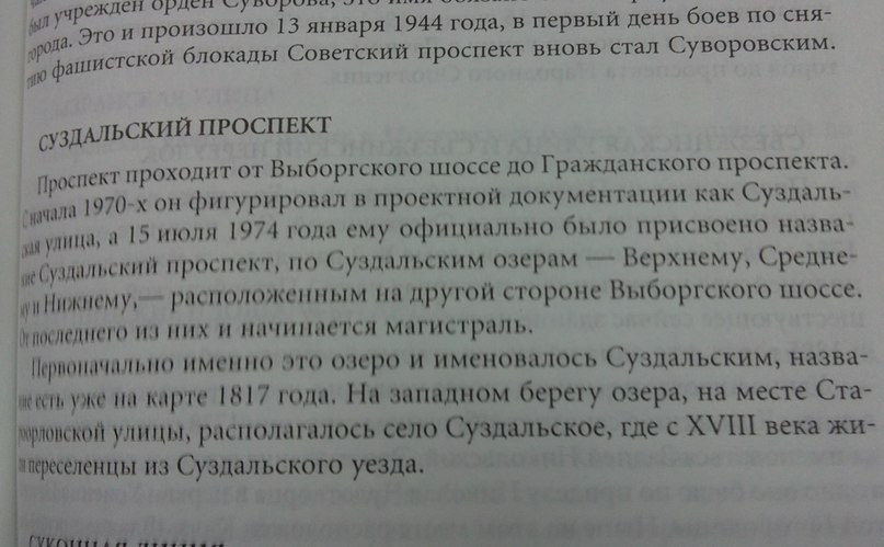 Полистала, увидела одну и ту же ошибку. Если в книге "Почему так названы" объясняя происхождение названия "Суздальский проспект" пишут что крестьяне-переселенцы жили на западном берегу Суздальского озера, то в этом издании "Петербург а названиях улиц" ещё и добавляют что "на месте Староорловской улицы". Откуда интересно источник этой неточности? Крестьяне Суздальского уезда Владимирской губернии жили на восточном берегу, а не на западном. Авторам надо в архив, посмотреть исторические карты. А не импровизировать с улицами и берегами.
