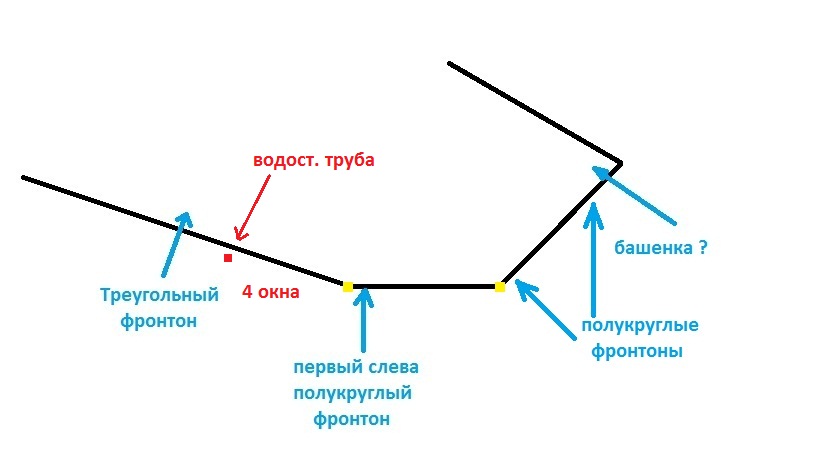 чуть правее но где то так , снято со строящегося моста . Значит дом проще : 2 одинаковых фасада отличающихся протяжённостью (на 2 или 4 окна по фасаду) но одинаковых по архитектуре (высокий фронтон в центре и 2 ракушки по бокам) на снимке мы видим фасад по Оренбургской ( почти "анфас") и башенку выступающую за красную линию на Клинической , линя съёмки точно совпадает с фасадом по Клинической , он для нас "в профиль" .