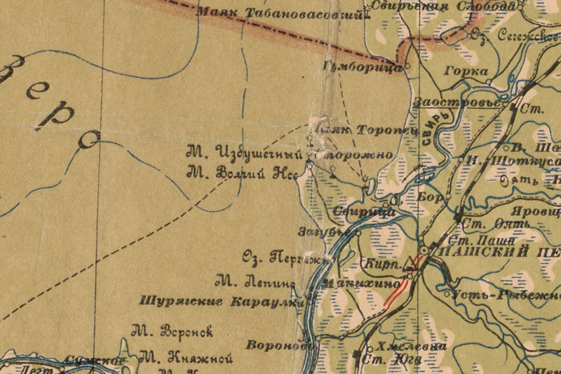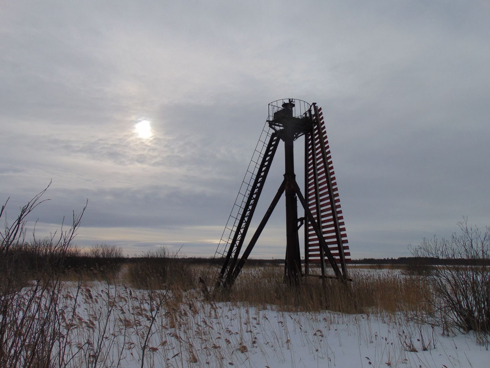 Похоже прояснилось происхождение металлического маяка на Торпаке. Посетил остров Горготуха в устье Свири. Меня интересовал Чомбовский створ. Первый створный щит опирается на мачту силуэт которой указывал на родство с металлической мачтой на Торпаке. Осмотр вблизи подтвердил предположение - мачты по конструкции очень схожи, различия в деталях. Обходя створ заметил в камышах по направлению маяка в Лисьей (второго знака Чомбовского створа) три наклонных столаба. Думаю отсюда мачта и переехала на Торпак.