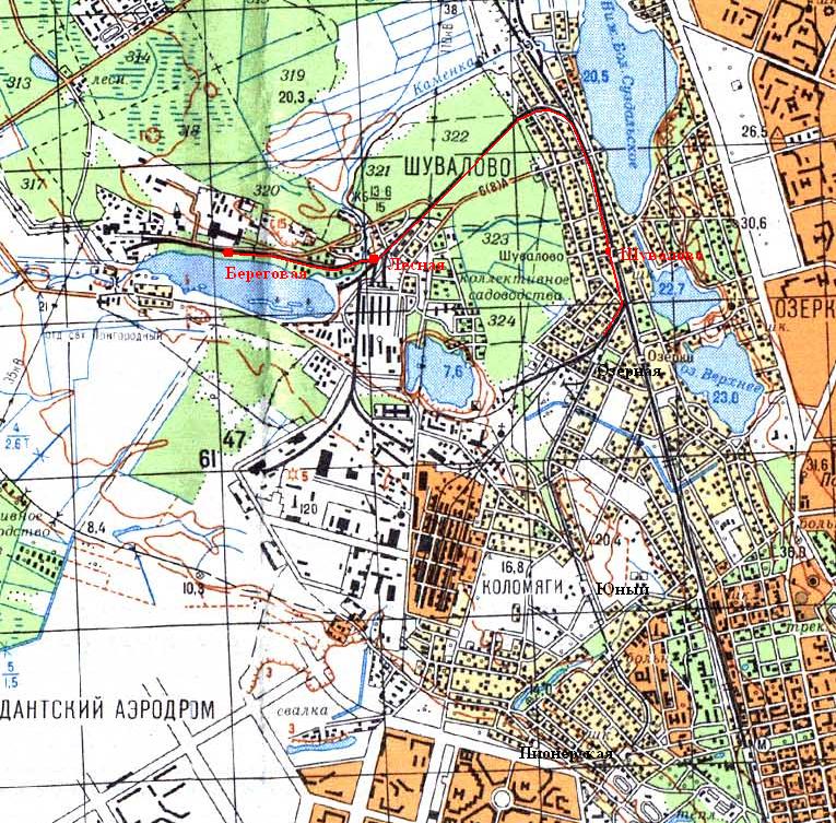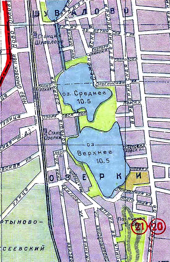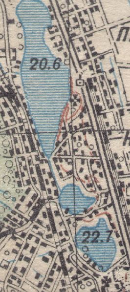 Я все-таки продолжаю считать, что их рыли (возможно, не дорыли) для прохождения прогулочных лодок или даже для парового катера - иначе зачем было их делать такими широкими? Как видим, до войны разница уровней озер была существенно меньше, чем сейчас (а до революции, наверное, еще меньше), и выравнивание уровней при соединении озер каналами не привело бы к существенным их изменениям.
