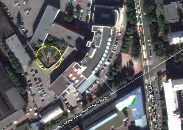 В скверике, где нарисован памятник, ничего не видно (он на закрытой территории института).