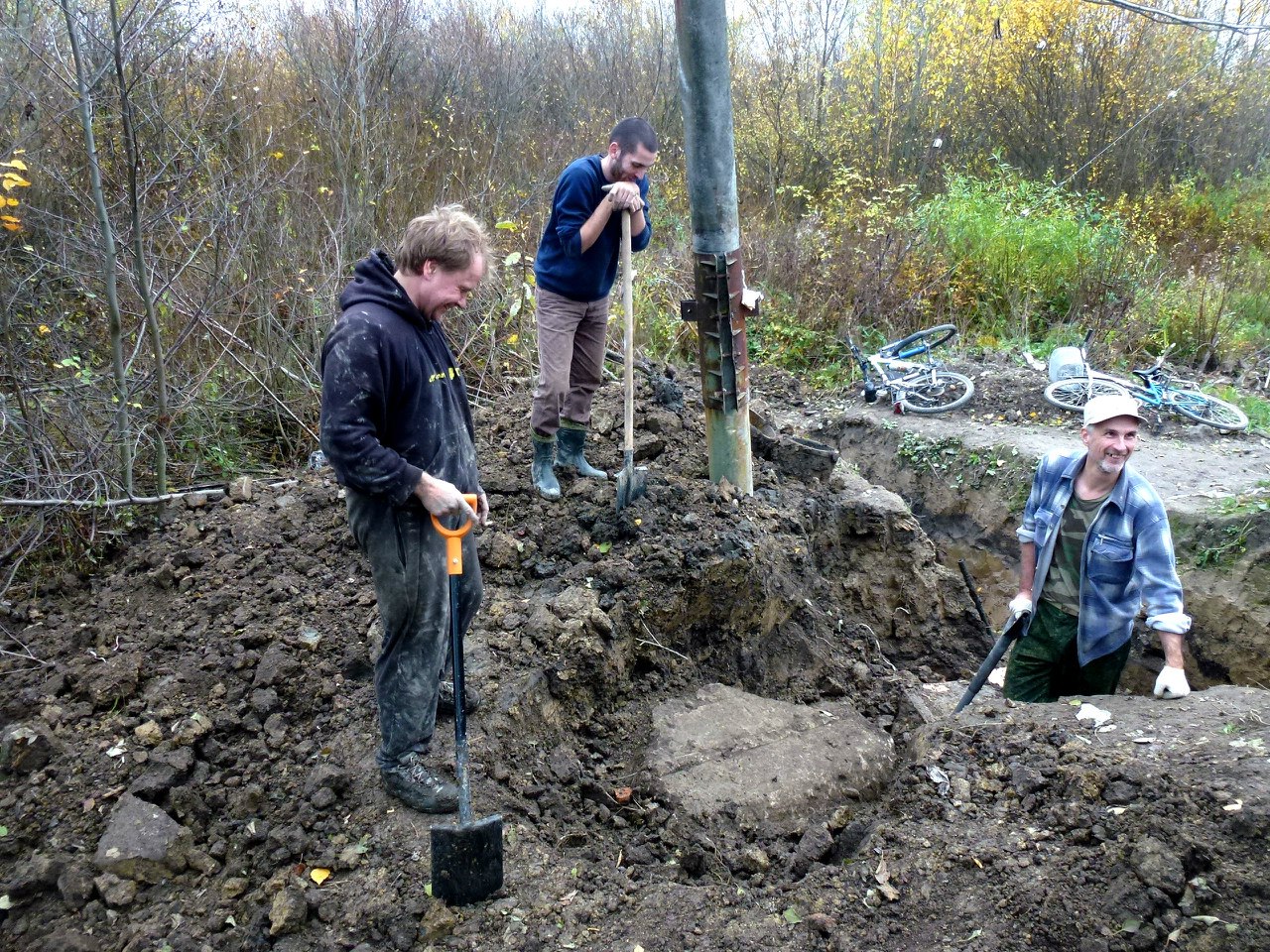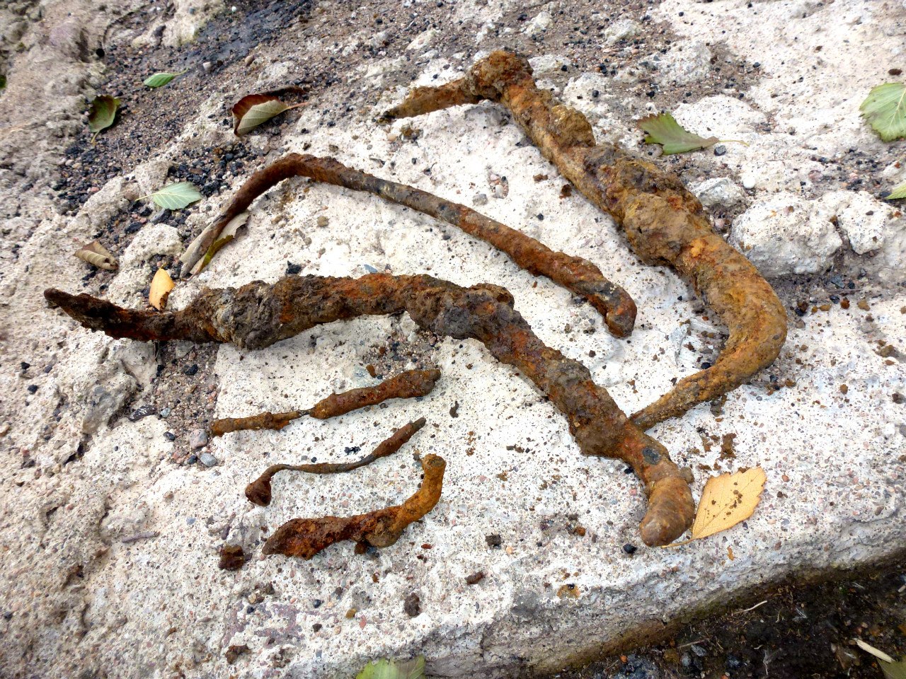 Показать полностью.. Сам колодец сильно углубили до синей глины. Но в колодце пока ничего не нашли, кроме пары бетонных колец, толщиной с радиомачту и, скорее всего, того же происхождения (брошены в колодец при засыпке, как мусор). Рядом с колодцем лежал здоровенный неопределенной формы кусок бетона, похожий на выброшенную часть неудачной отливки угла или стены ДОТа. Еще раскопали много железных скоб, которые стягивали все эти деревянные части в земле.