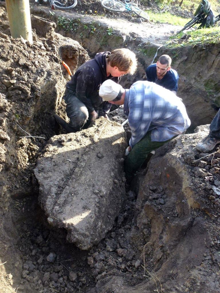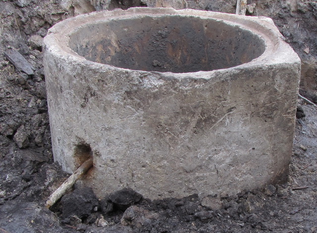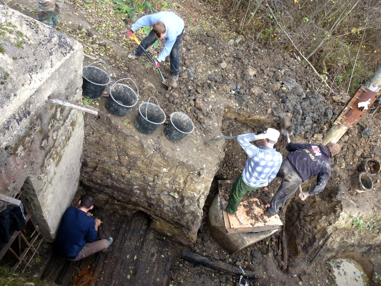 Результаты раскопа вокруг колодца. Сверху, возможно, кусок неудачной отдивки стены ДОТа. Труба из колодца в ДОТ проходит под деревянным настилом из толстых бревен.