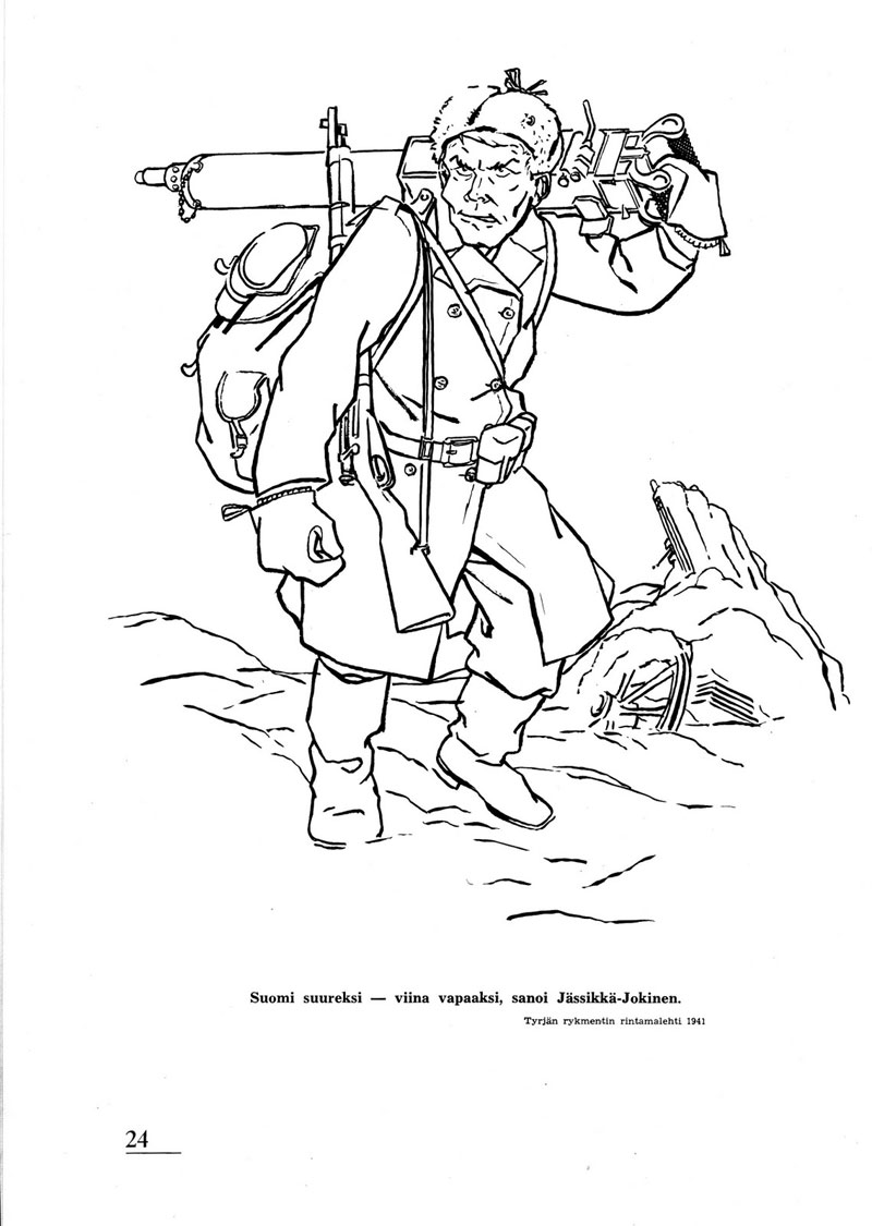 Рисунок был опубликован в 1960 году в книге "Nauru Sodalle" (~ "К войне со смехом"), под ним текст на финском, если я правильно понимаю, что-то типа "Больше Финляндия - свободней водка, сказал Яссикка-Йокинен". Хотя не вполне уверен, потому что первая часть является финской поговоркой, как подсказывает гугл и может быть также в вариации "больше дубина - свободней водка". Но в любом случае тут не пахнет никакими похоронами русских. И как там ниже значится, источником является боевой листок Тюрьинского полка (т.е. JR7) 1941 года. А художнику Юсси Аарнио, которому приписывается авторство, в 1939 году было 7 лет. Кто-то разжигает. Либо Энгл/Паананен , либо при нашей публикации.