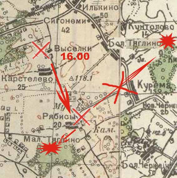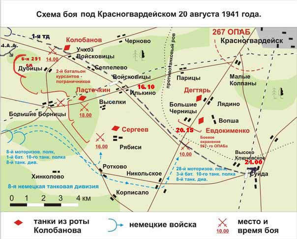 | Цитата: | Танки пр-ка в количестве до 30 штук прорвались на Псковское шоссе у Бол. Черницы и были накрыты огнём нашей артиллерии и системой ПТО. Выведено из строя 3 танка, 10 танков остановлены эскарпе, остальные повернули на восток и ворвались ст. Суйда в 21:00 20.8.1941.
