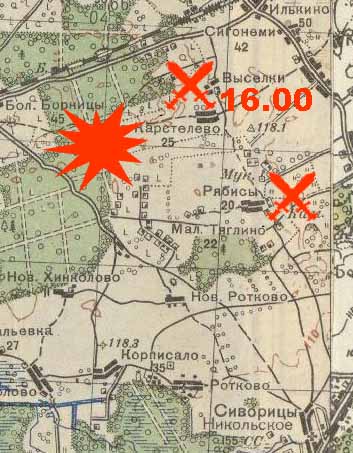 Тут все не так однозначно(это я по поводу ваших отметок на карте). С одной стороны да действительно в ЖБД 8 тд сказано "400 m nordwestlich Tjaglino". С другой стороны по нашим документам место потери танка "Мал.Тяглино", "Ю.Рябисы" и даже "Ново-Ротково" - что в принципе можно толковать как лес восточнее М.Тяглино(при допущении что в немецком ЖБД спутали восток и запад).