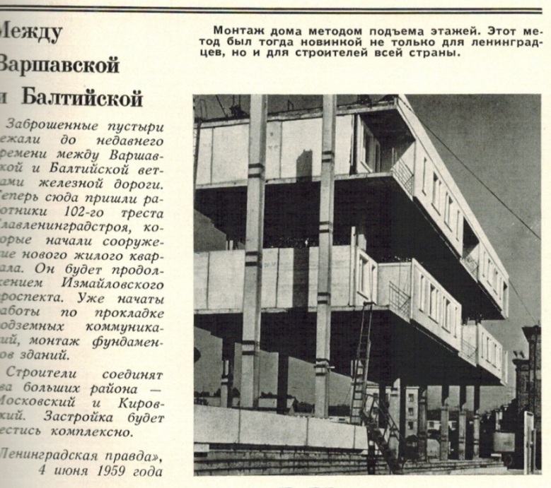В 1959 г. в Ленинграде на ул. Магнитогорской был построен методом подъема этажей опытный четырехэтажный односекционный 32-квартирный жилой дом.