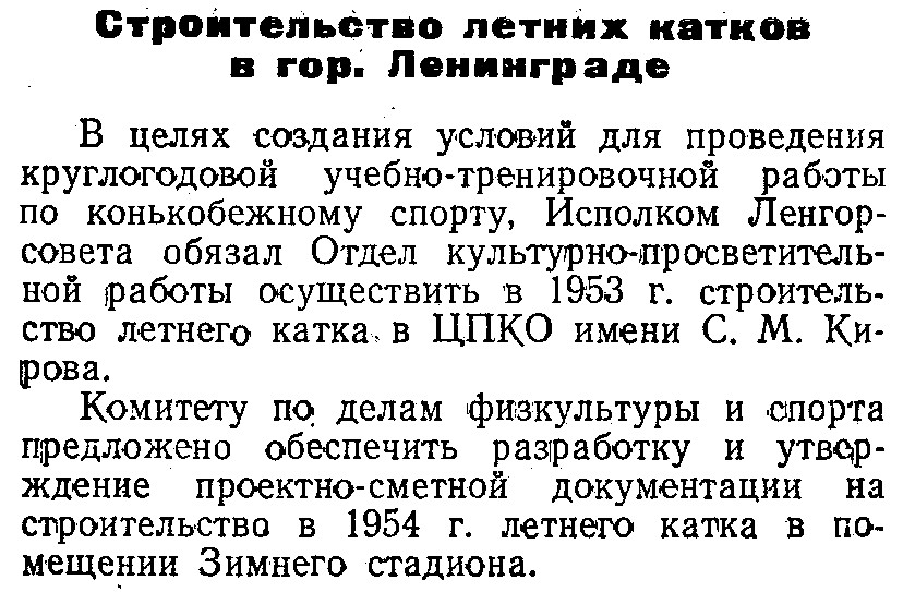 Летних катков, разумеется, тоже не построили. Единственный искуственный каток, насколько я помню, был на наб.лейтенанта Шмидта, в церкви Успения. Там тренировались Белоусова с Протопоповым.