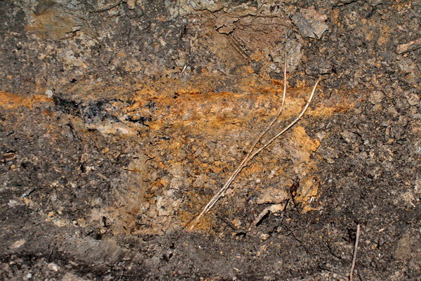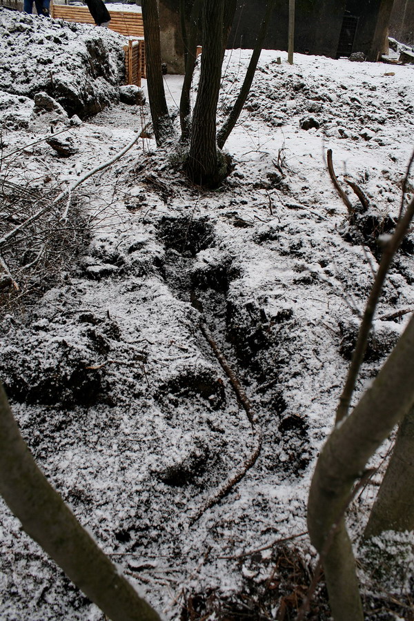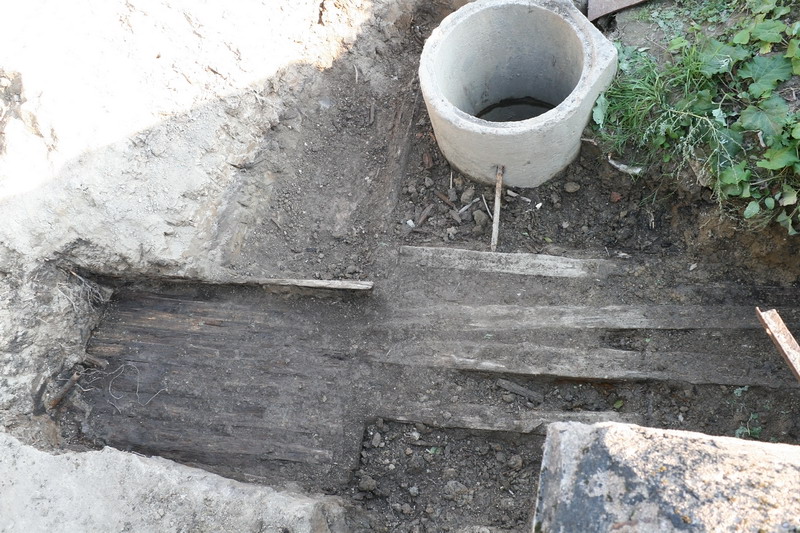 В субботу у дота продолжились работы. Была откопана часть настила, идущего от дота к колодцу. Но настил идет не только к колодцу. В тылу дота находится небольшая площадка(?), как минимум с одной стороны ограниченная вертикально положенной доской. В конце этой площадки найдена труба, из которой выходит четыре провода. Внутри труба залита смолой.