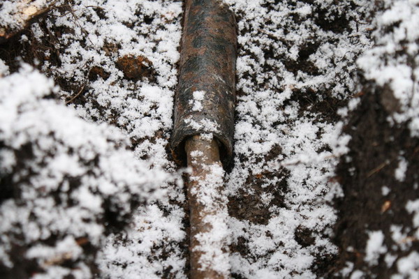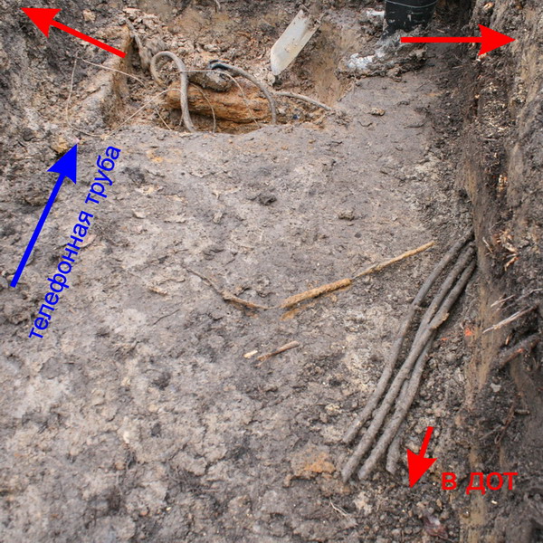 Под небольшим углом телефонная труба-канал повернула в направлении землянки за дотом, и метров через 5-6, во втором ее конце была снова обнаружена вставленная тонкая труба, но стык без изоляции. Трубы проложены на глубине 25-30 см от современного уровня земли. Хотя нет оснований предполагать, что уровень в 1943 году был другим. В полуметре после стыка тонкая труба изогнута так, что она обогибает место землянки.
