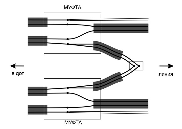 Так на схеме всё очень точно показано. По два кабеля в каждую муфту. А куда они уходили, кто ж знает.