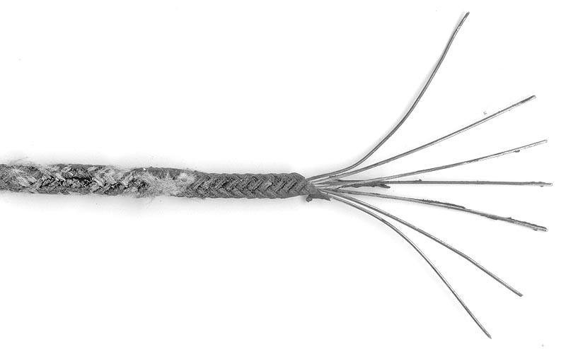 7 жил; три медные, остальные железные, упругие. Все жилы диаметром 0,3 мм