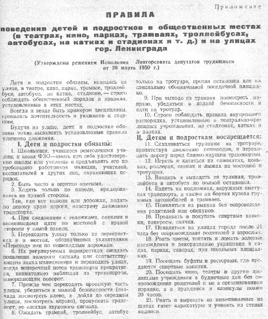 Интересен запрет посещать буфеты и рестораны (даже в сопровождении взрослых?),где продаются спиртные напитки. Насколько я помню из своего счастливого сталинского детства, спиртное тогда продавалось практически во всём общепите, за исключением разве что школьных буфетов. И так было вплоть до известного постановления 1958 г., когда начались первые ограничения.