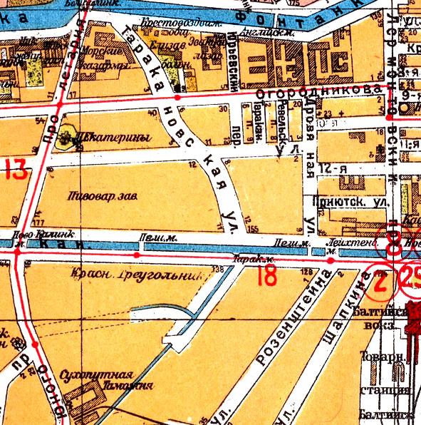 Так вот, в Википедии утверждается, что Борисов мост был построен в конце XIX века и реконструирован в 1928 году, а Таракановский построен в 1933 году и реконструирован в 1975. Насчёт даты постройки Борисова моста - вроде всё так, на всех картах, начиная с 1913 года, мост присутствует, правда без названия, а точнее - с подписью "Пеш. мост" (точно также подписывался и мост в створе Дровяной ул.).