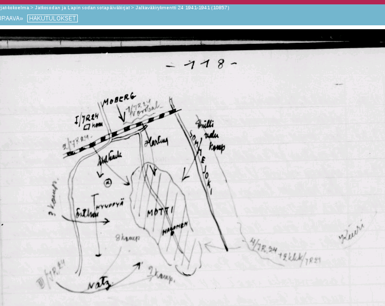 Эта и другие фотографии этого места можно найти следующим образом: сайт sa-kuva.fi , выбираем обязательно финский интерфейс (в других поиск не настолько полный), затем вкладка Jatkosota (даты периода поиска не трогаем), ставим галочку +päivättömät, в поле поиска вводим номер фото 42031 и нажимаем кнопку "Hae"