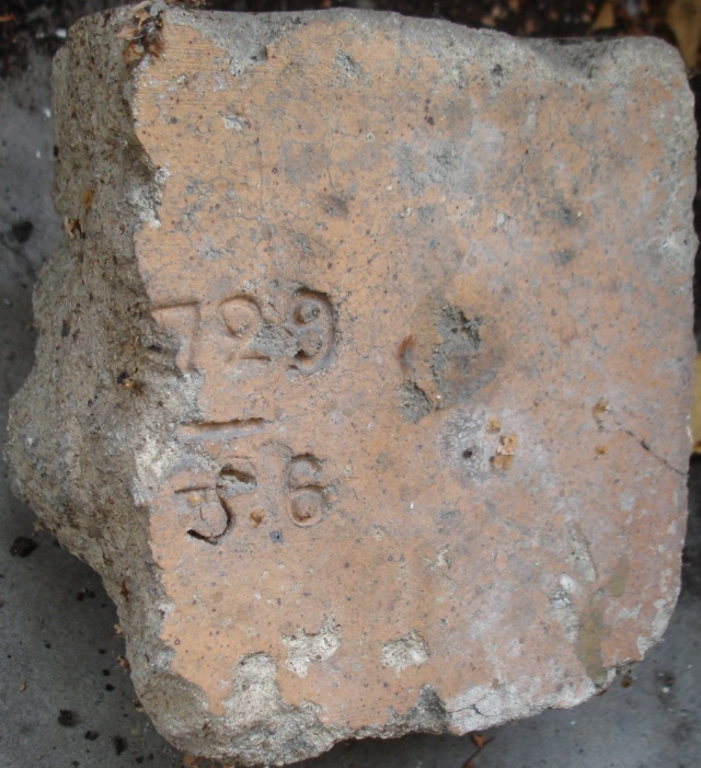 Кирпич с развалин Ропшинского дворца.Возможно,клеймение говорит о дате - 1729г?Хронологически совпадает с проведением там первых каменных работ.