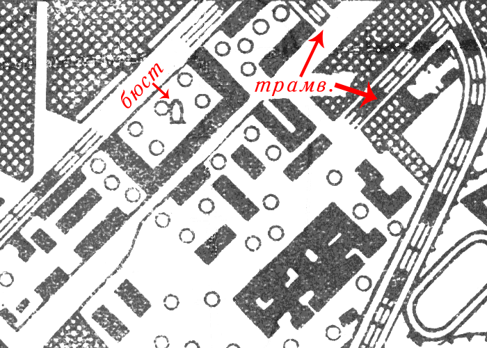 Дублирую сюда, т.к. пользовательские картинки в комментах на pastvu всё равно не видны, а здесь есть шанс, что у кого-нибудь найдутся фото если не трамваев, то хотя бы этих путей.