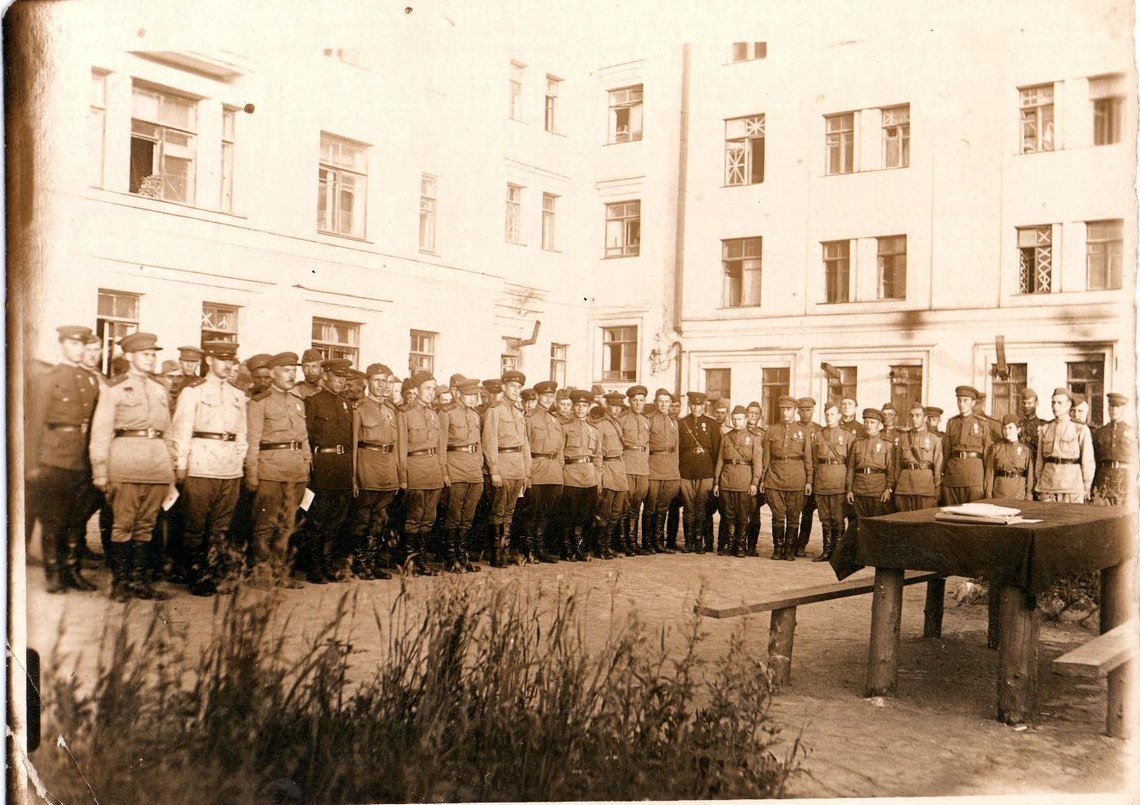 Построение для вручения медалей «За оборону Ленинграда». Офицерам штаба 79 УР во дворе штаба. Лето 1943 года.