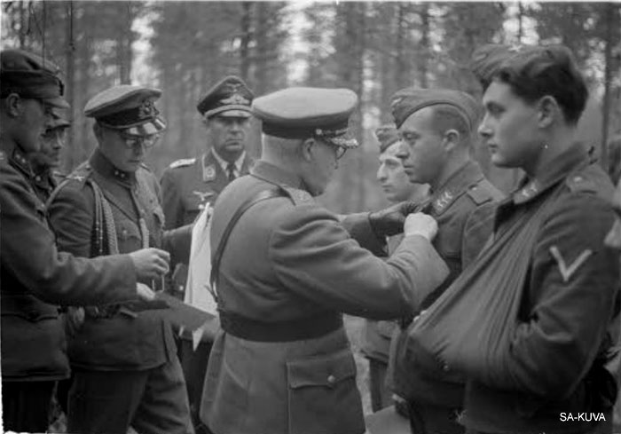 Из нового финского фотоархива. Полковник Ярвинен вручает награды отличившимся в нападении на остров Сухо . На заднем плане подполковник Зибель. Сортанлахти, 29.10.42.