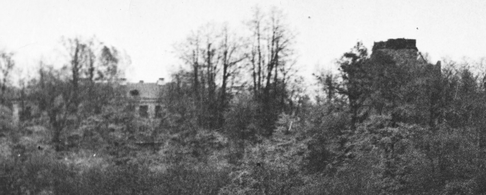 усадебный дом в окружении старых деревьев, а правее него - руины церкви или какой-то башни.