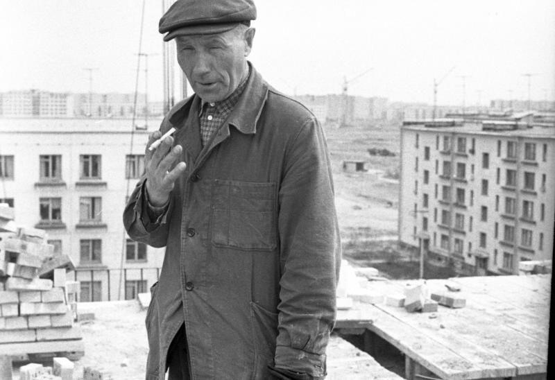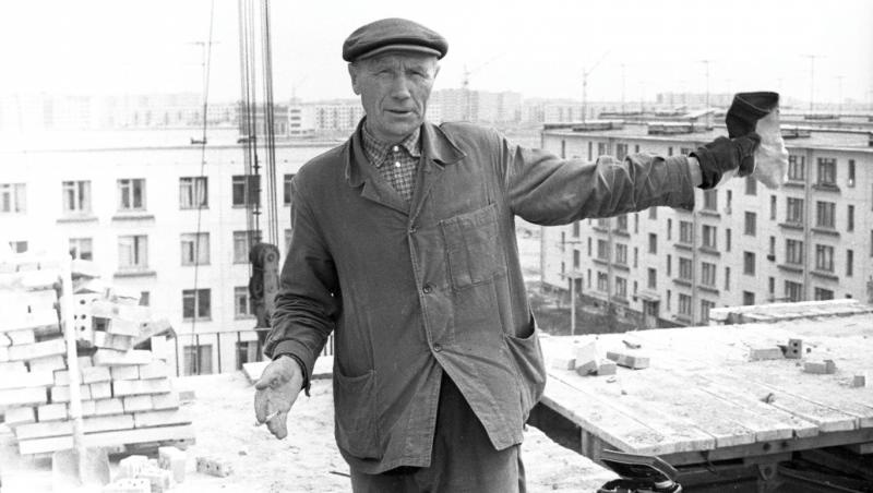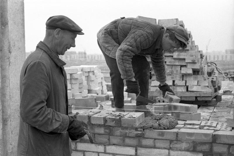 Но первые две фотографии ставят меня в тупик. Позади женщин-каменщиков в два ряда пятиэтажки, причем первые две, похоже, серии ГИ. За ними кирпичная девятиэтажка серии 1-528кп-41/42/43.