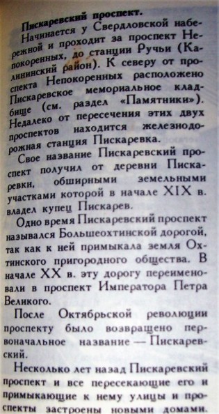 Как известно, Пискаревский проспект получил свое современное наименование в январе 1944 года. Однако какое-то время название это возводилось к дореволюционной эпохе. Ниже - кусочки из двух книг (по Пискаревскому проспекту приведены целиком): "Почему так названы?" издания 1962 года (и двадцати лет не прошло) и "Ленинград от А до Я" 1971 года: