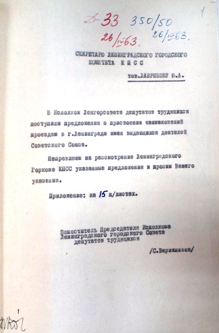 Из истории подготовки решения 1964 года, согласование по партийной линии (ЦГА СПб. Ф. Р-7384. Оп. 42. Д. 188. Л. 1). Прилагаемый к документу список предлагаемых к увековечению лиц не очень большой - 24 человека. Кого-то увековечили в 1964 (Герман, Вс. Вишневский) или 1965 (Бутлеров), кого-то позднее (Есенин), до кого-то и вовсе не дошло (В. Саянов). Инициаторы - как организации (Например, ЛО Союза Писателей), так и частные лица (так, с полдюжины деятелей первых лет Соввласти - Крупскую, Луначарского, Антонова-Овсеенко, Подвойского и Дыбенко с Крыленко - предлагал увековечить некто Лившиц В.М. из Риги).