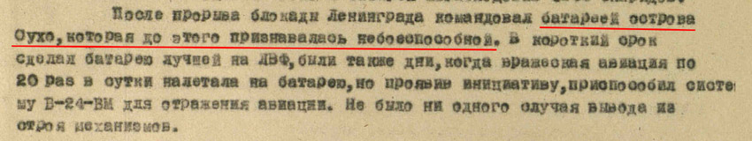 Командиром батареи острова Сухо он был назначен в июле 1943-го, стало быть подчеркнутое относится к этому времени и батарея до сих пор не восстановлена после боя в октябре 1942.