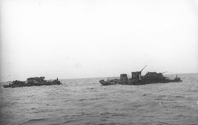 Я бы только предположил, что это был не взрыв боезапаса (единственный паром с 88-мм боеприпасами находился дальше всех от Сухо на север, у остальных сидевших на мели были 20-мм автоматы), а с ТЩ-100 заметили активность на палубе Зибеля и всадили по нему, уничтожив шлюпку и ранив бойцов.