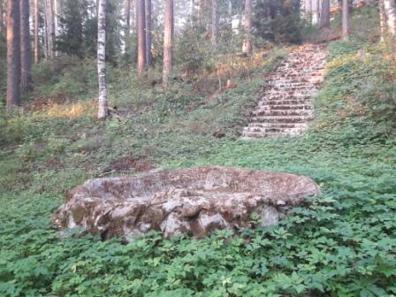 От большой лестницы (стоим внизу, спиной к озеру): справа тянется невысокая каменная гряда, я согласна с тем, что это была ограда. Если пойти влево по тропинке вдоль берега, через метров 100 (примерно, не замеряла), ещё одна небольшая лестница ступеней на 10, перед ней остатки старого фундамента или причала.