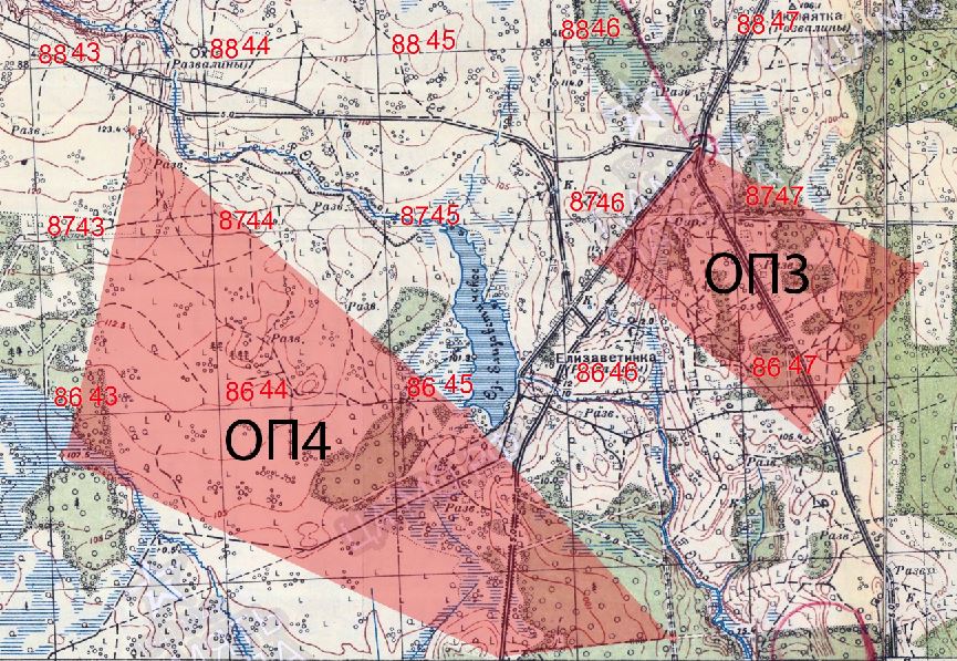 Пушка 85мм находилась в ОП3 , известный ТОТ находится 300м севернее перекрестка в верхнем углу ОП3. С некоторой натяжкой можно посчитать, что там и был ТОТ КВ-220. Пушка 152мм (КВ-2 ?) находилась в ОП4.