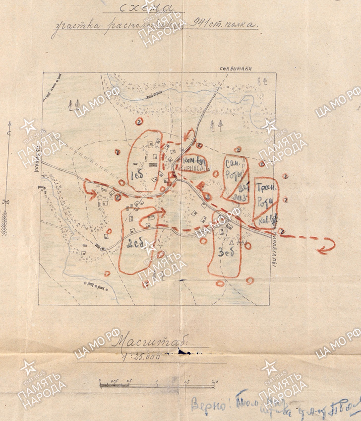 941 СП имея 2 ручных пулемета и 5 минометов занимает оборону в укрепленном районе Нов.Кирьясалы - Кирьясалы - погранзнак №150. КП - отметка +2.2 (0840)