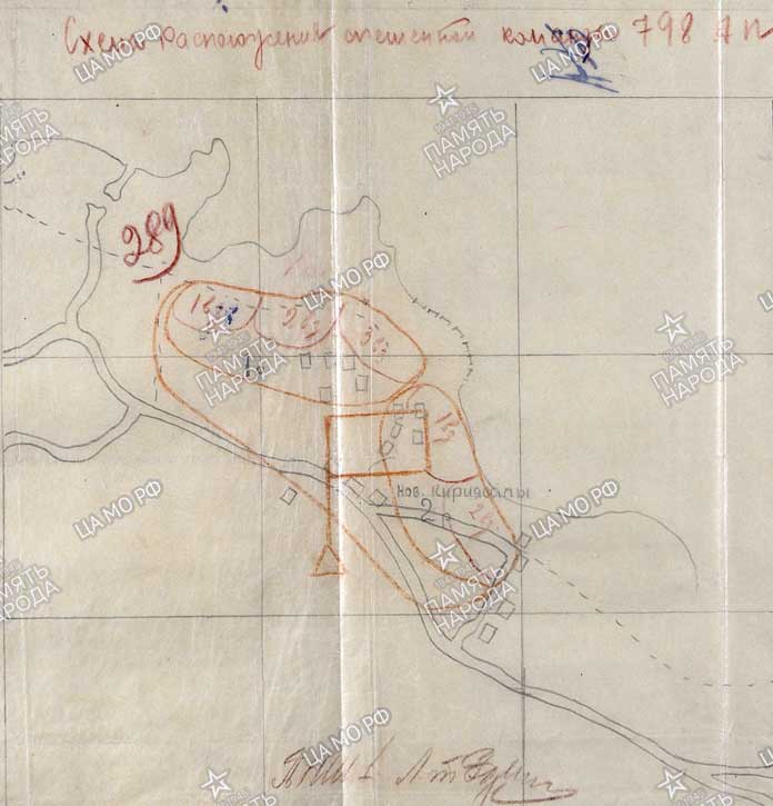 2. Спешенное подразделение 798 АП потеряв связь и будучи отрезано от 941 СП, начали выход из боя и самостоятельно, к 12-00 5.9.41 вышли в район, занимаемый нашими войсками. Взвод 4-й батареи в составе двух орудий и 1 зарядящика ведя бой в окружении, после потери конского состава, бул оставлен на огневой позиции в районе развилки дорог 1.5 км юго-восточнее Нов.Кирьясалы. Неоднократные попытки вывезти материальную часть в силу численного превосходства противника, особенно огневых средств, успеха не имел. Распоряжением командира 2/798 АП орудия в 23-00 были взорваны. Командный пункт 798 АП пробившись через группы окруживших белофиннов к утру 5.9.41 был перенесен в район Мал.Кайдалово. 798 АП в результате боя 4.9.41 понес потери... (15 человек убито и 15 пропало без вести)