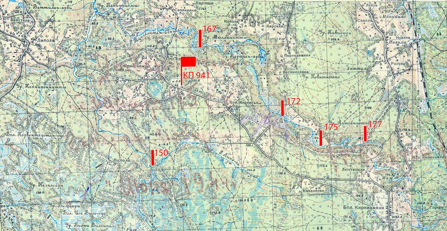 Ну, леса как такового между Кирьясало и Стеклянным нет - это болото, да еще и с хорошими ручьями из него вытекающими. Но вообще-то из Стеклянного в Кирьясало идет вполне торная тропа, имеющая выходы как к старым Кирьясалам, так и к точке +2.2 а также южнее Уусикиля. С мостиками через ручьи и т.п. По крайней мере на картах начиная с конца Х1Х века она есть. Другое дело, что о ней могли не знать спешно отошедшие на Кирьясальский выступ части, да и технику по ней протащить было бы сложно (с учетом что финны специально послали отряд перерезать ее), однако вот та "часть бойцов и командиров" что вышла к 946СП - вышли как раз по ней: